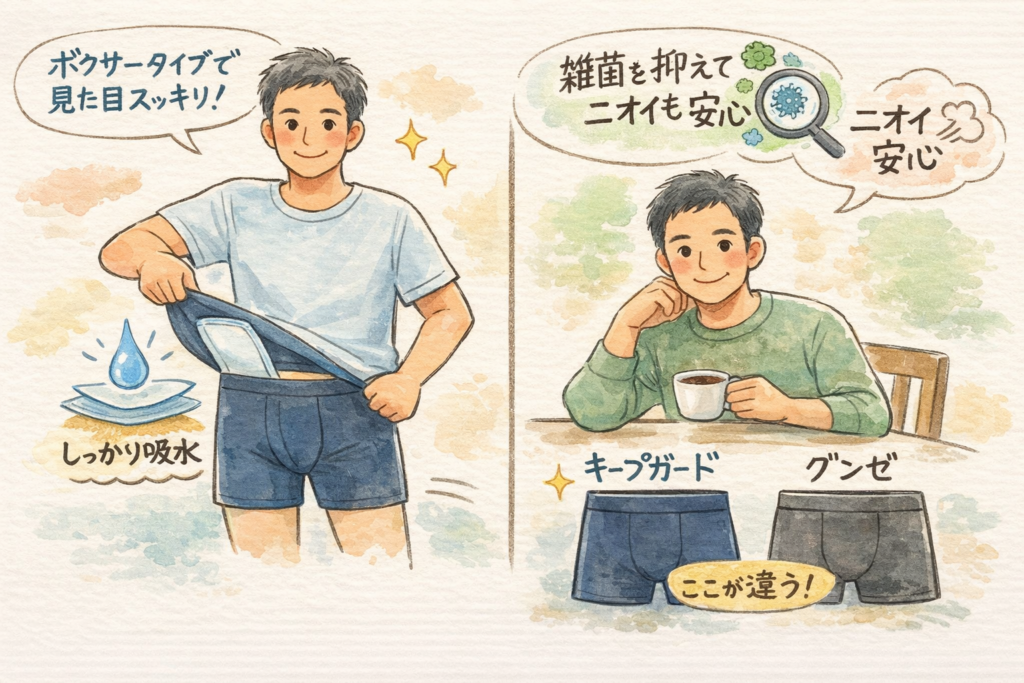 40代頃から気になり始める残尿感や下着の不安。キープガード尿漏れパンツは、見た目は普通のボクサーなのに、吸水性や雑菌抑制にも配慮されています。気になる臭いは大丈夫か、グンゼとの違いは何か。そんな疑問をまとめて整理します。