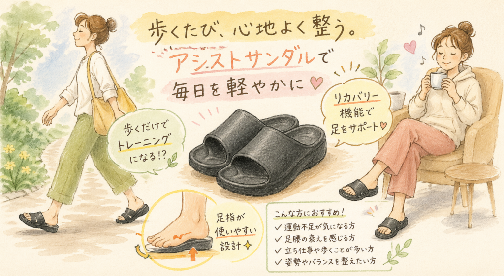 「歩くだけでトレーニングになる」という言葉に興味を持つ人は多いでしょう。アシストサンダルは、日常の動きを少し変えることで体の使い方に影響を与える設計とされています。ここでは、その実際の仕組みや期待できる範囲について解説します。