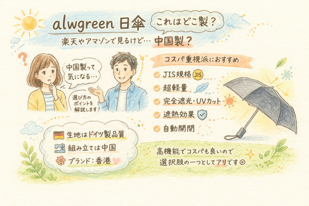alwgreen日傘は楽天やアマゾンで見かけるものの、「どこ製?中国製?」と気になる方も多いのではないでしょうか。本記事ではメーカーや素材、特徴までわかりやすく解説します。